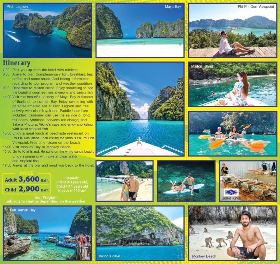 11:00 Visit the beautiful scenery of Maya Bay is famous of Thailand, Loh Samah Bay. Enjoy swimming with paradise emeral sea at Pileh Lagoon and free activity with clear kayuak and paddle board are included (cusotmer can use the service of long tail boats : additional services are charge, and take a photo at viking's cave and enjoy snorkeling with local tropical fish.